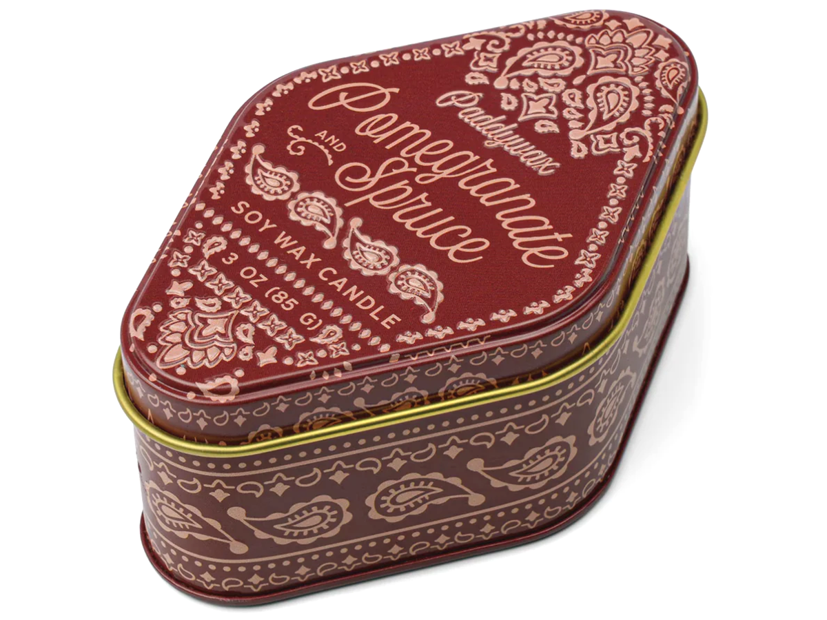 The motel keychain-shaped tins are embossed with a bandana style art. The woody fragrances evoke a sense of being in a National Park.3.5oz.Tinned candle.Approximately 2.85" x 4.3" x 1.87".