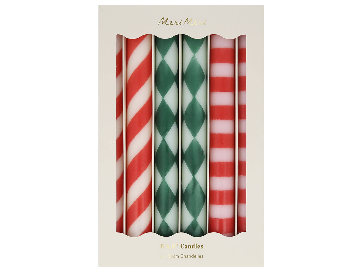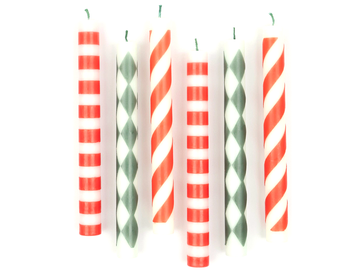 - 6 Striped candles with 3 designs of pink and red, mint and green, and red and ivory.- Dark green wicks.- Unscented.- Burn time approximately 7 hours.- Pack of 6 in 3 designs.- Product dimensions: Candle height - 9 inches.