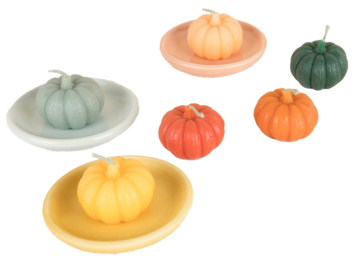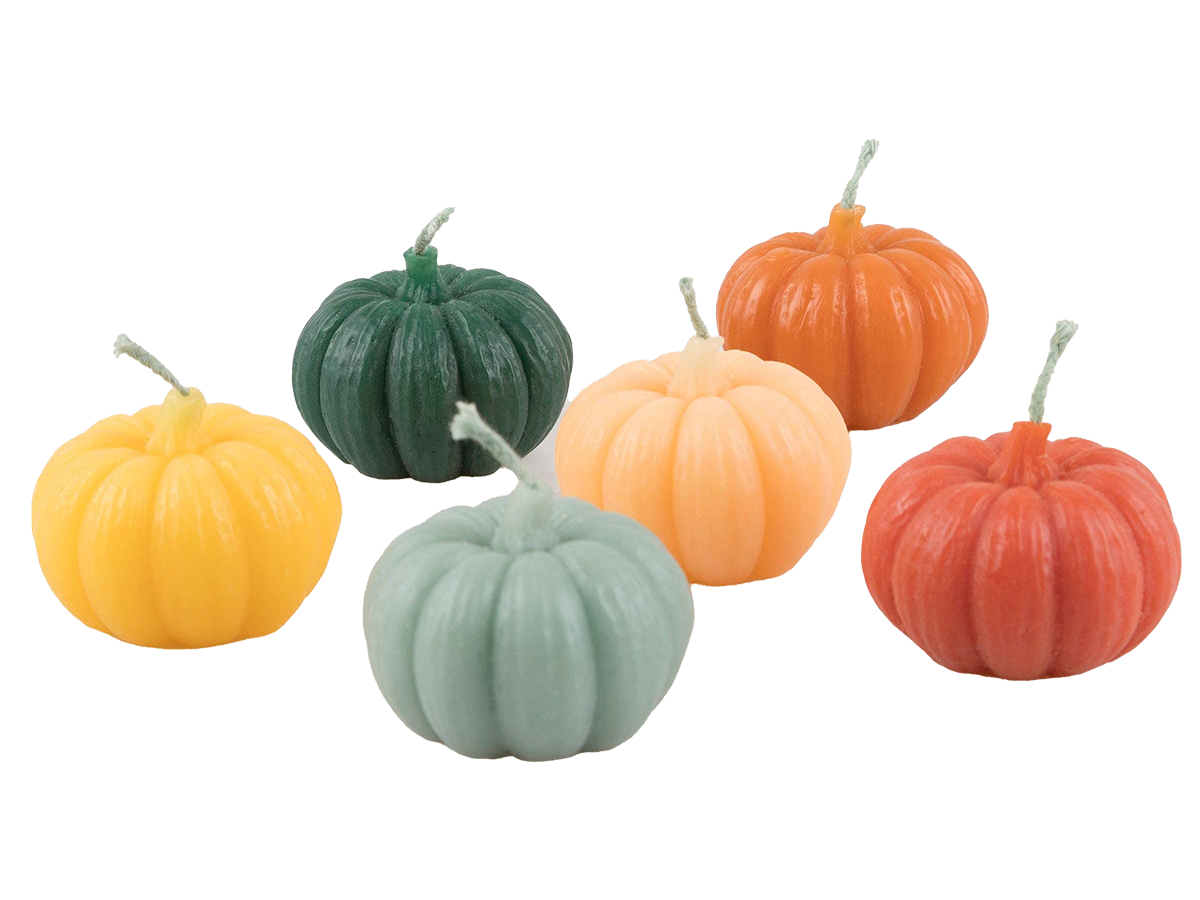 - 6 Pumpkin shaped wax candles in dark orange, orange, pale orange, yellow, mint and dark green.