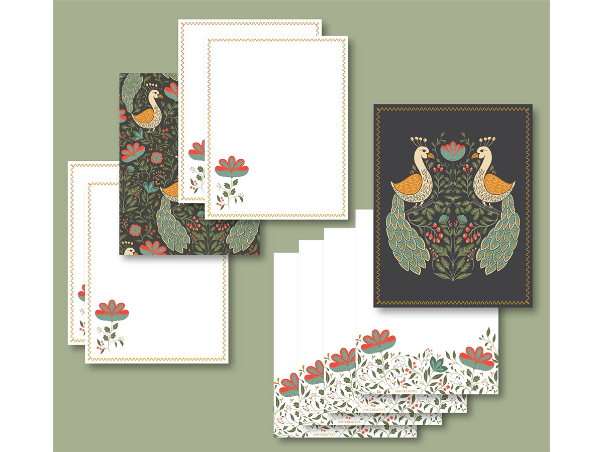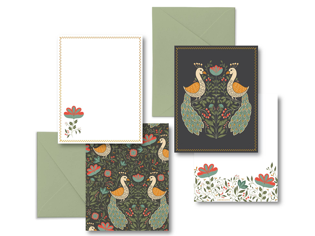 The Teal Peacock Floral Luxury Stationery Set features two intricately illustrated flat notecards with regal birds and botanical details in charcoal, coral red, teal, and green.