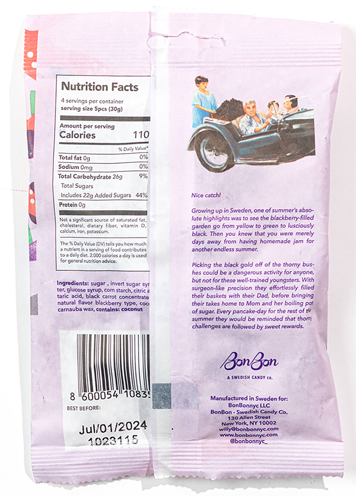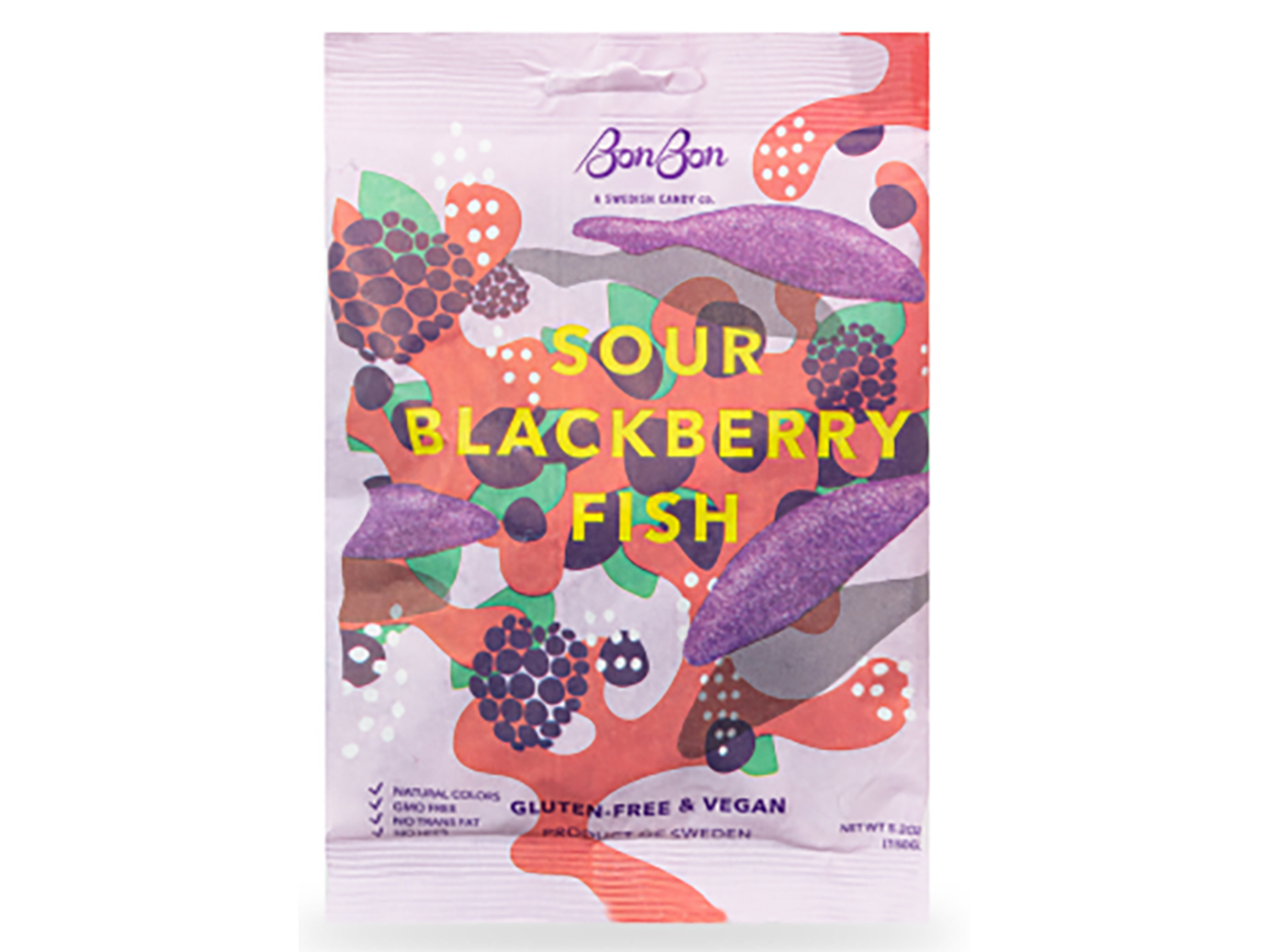 The sour Blackberry fish is a vegan, gluten-free and naturally colored and flavored sour gummy made by a small factory in the south of Sweden. This vegan and gluten-free candy is a fresh take on the classic Swedish Fish.-5.2oz.