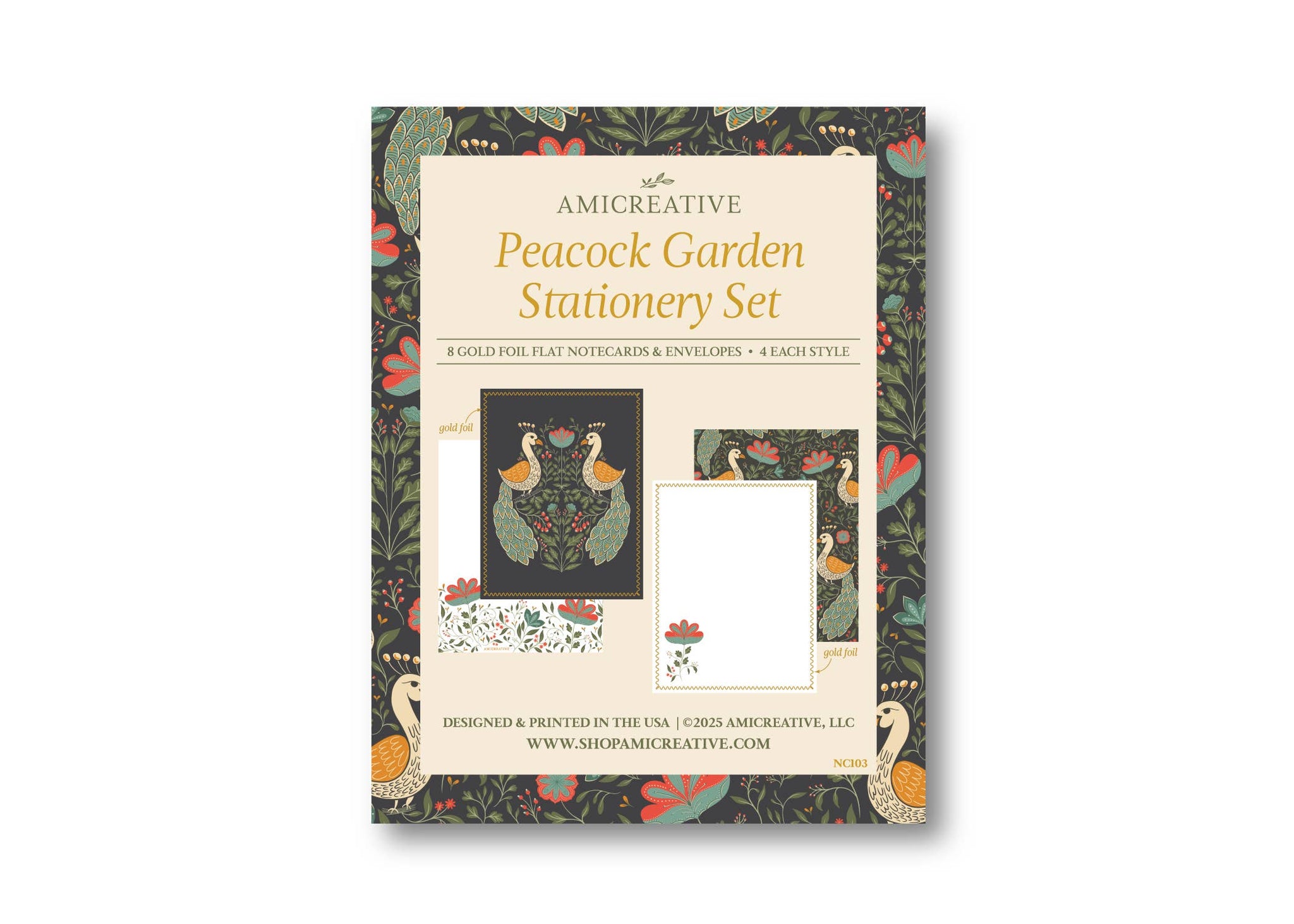 The Teal Peacock Floral Luxury Stationery Set features two intricately illustrated flat notecards with regal birds and botanical details in charcoal, coral red, teal, and green.