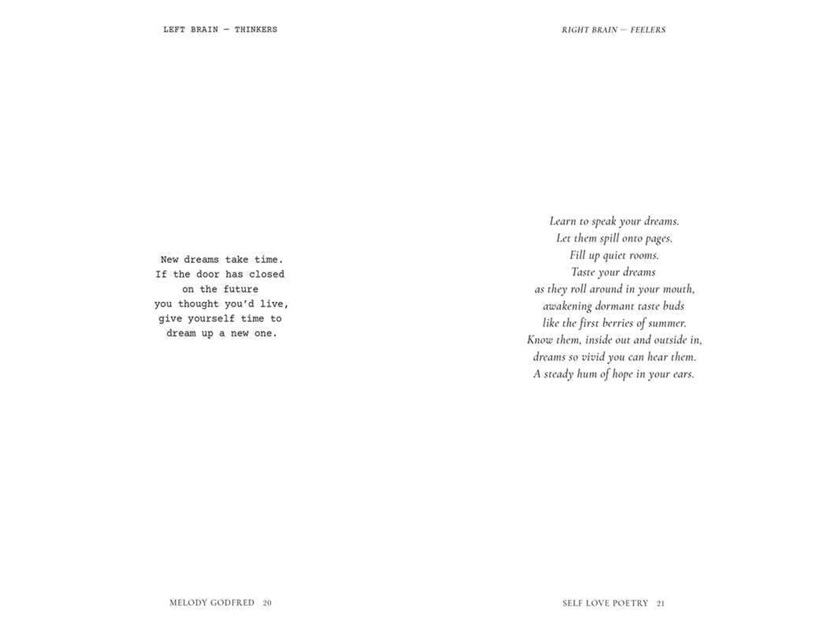 On the left side of the book are "thinker" poems that light up the analytical, more literal, left side of the brain, and on the right side are companion "feeler" poems that speak to the creative, more emotional right side of the brain.
