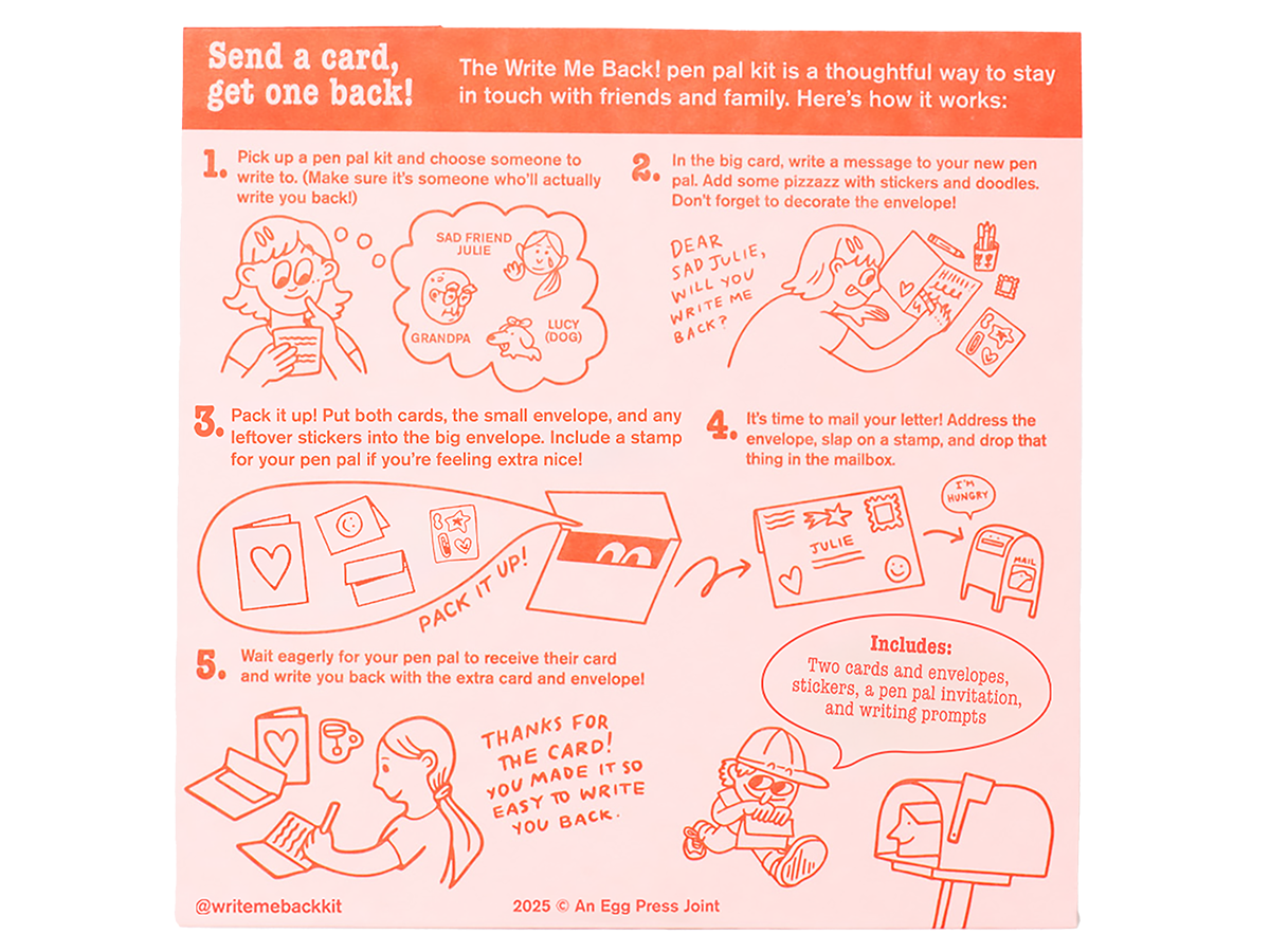 Pen pal kits make it super easy to write to a friend, and for them to write you back. When you send your card, you'll also send a miniature card and envelope, so your friend can write back to you, right from their mailbox!