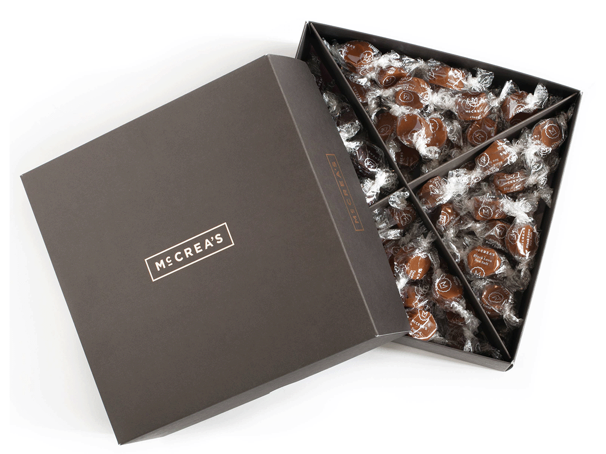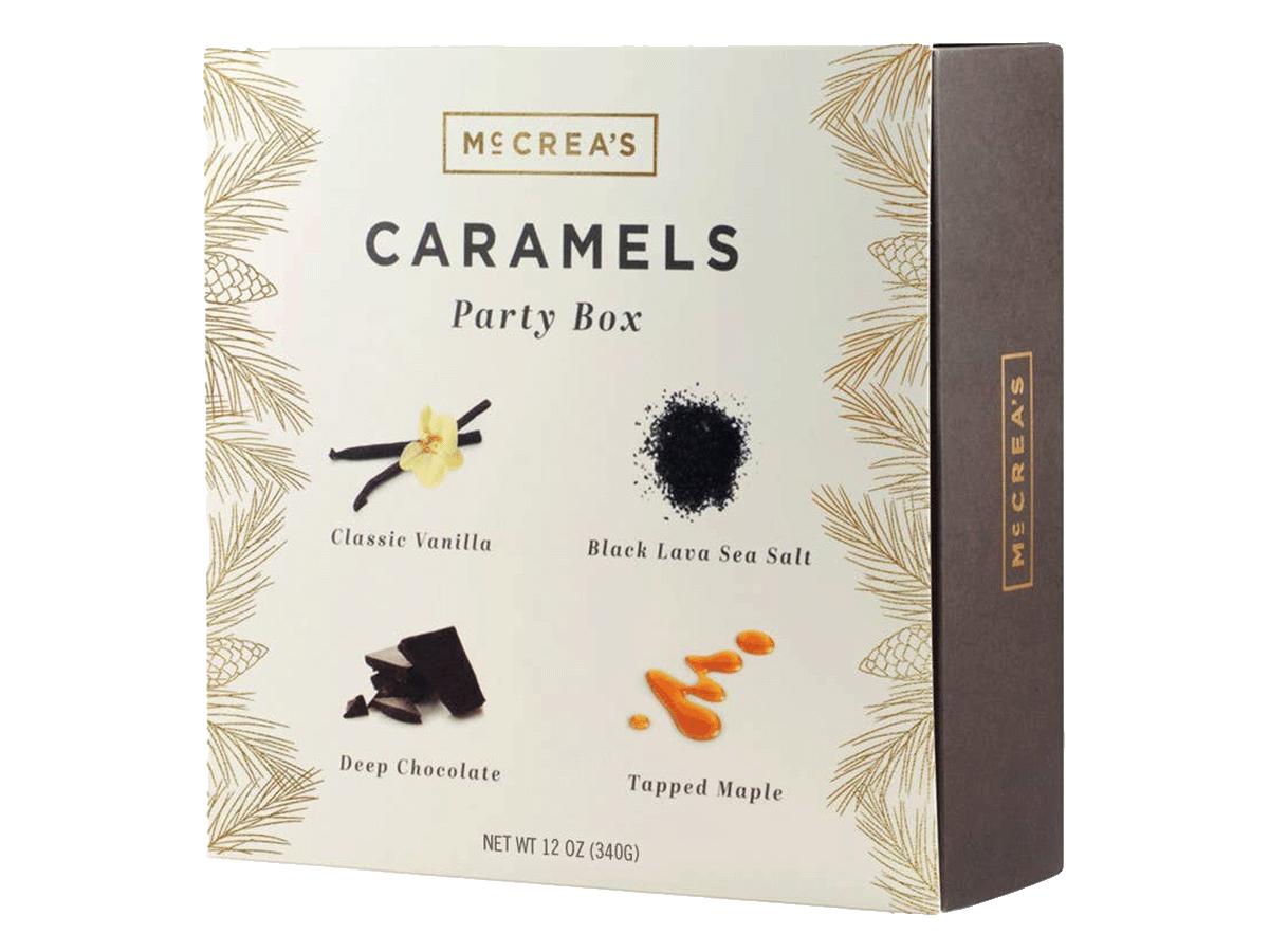 Celebrate the holidays with friends and family with this caramel party box! Flavors include:- Black Lava Sea Salt.- Classic Vanilla.- Deep Chocolate.- Tappered Mapple.Approximately 10 pieces each.