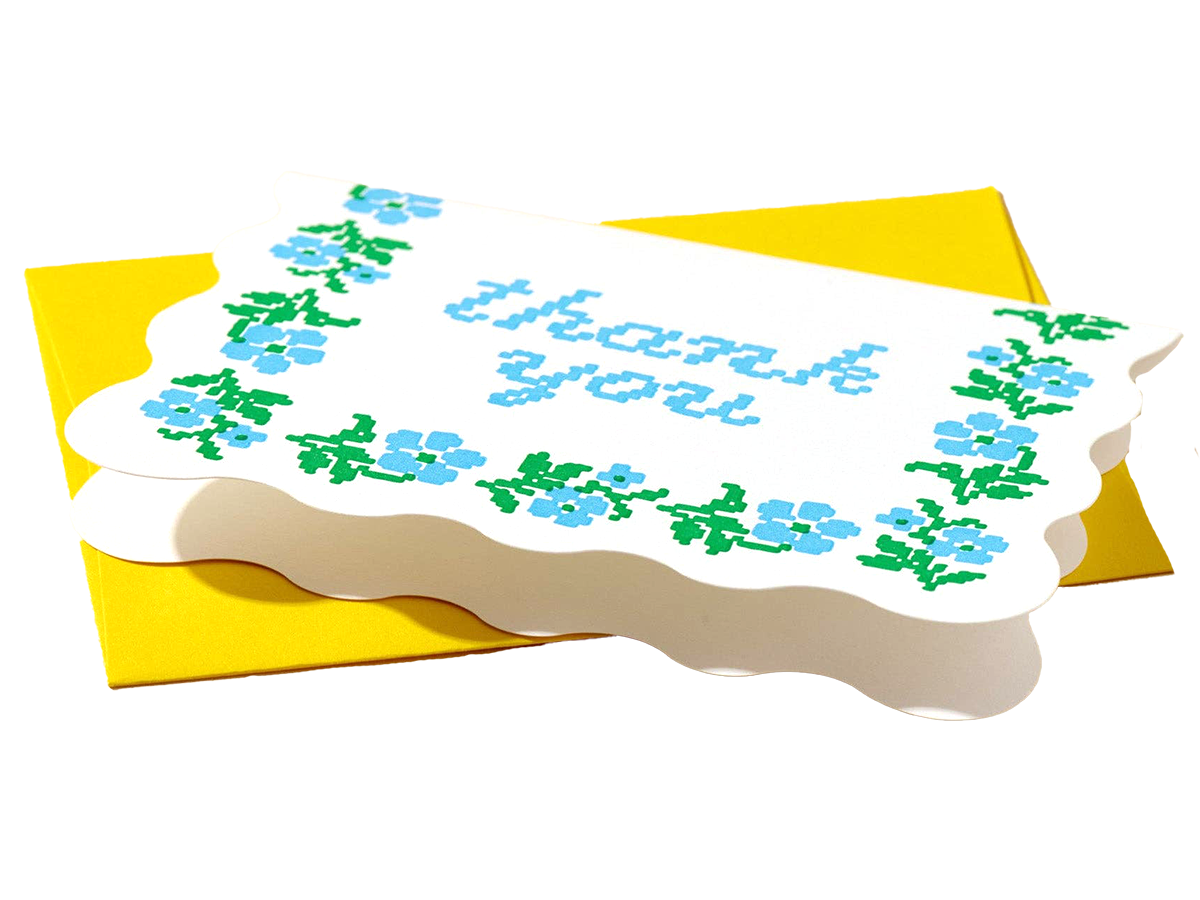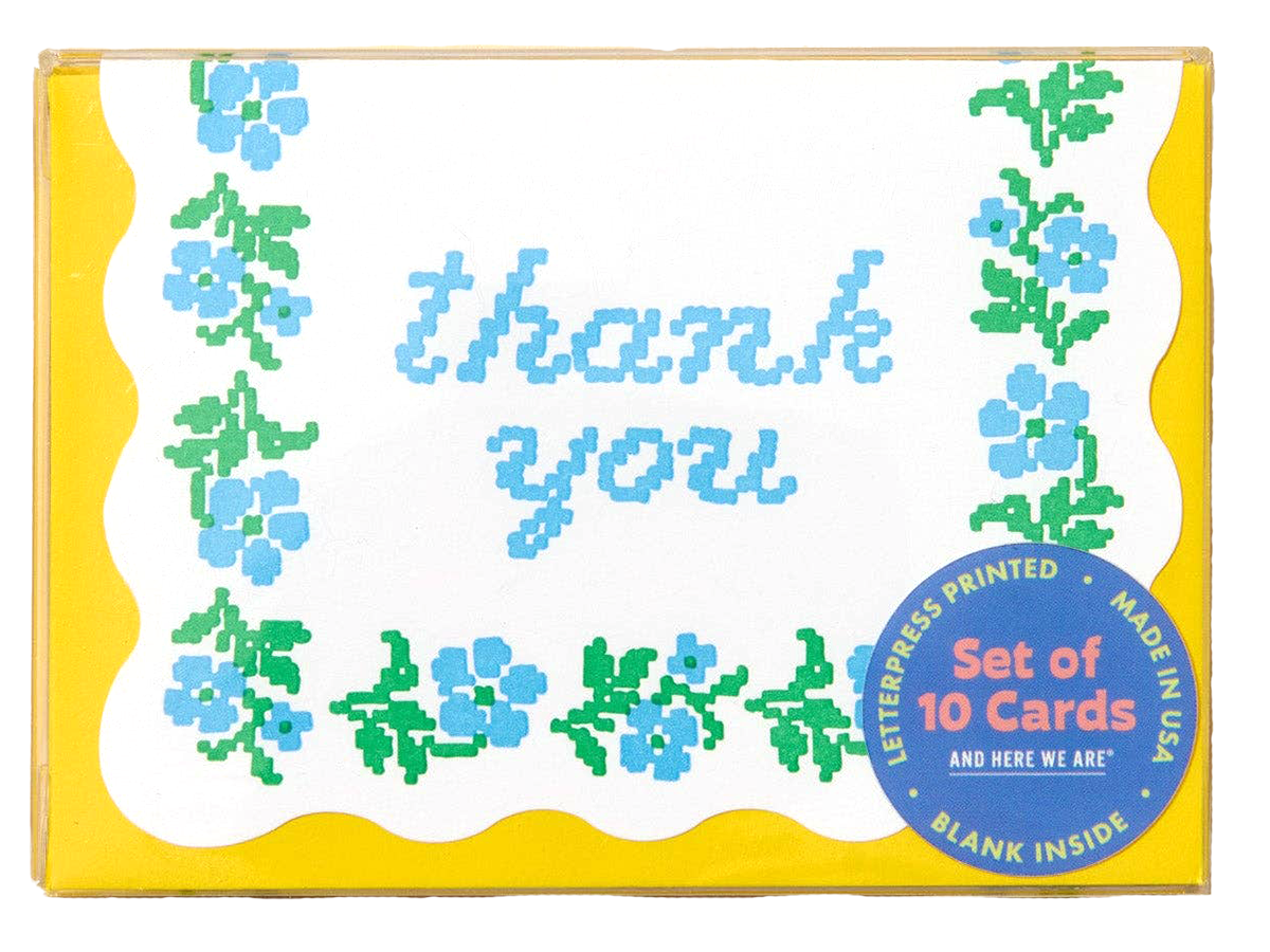 A set of 10 delicate, cross-stitched flower thank you cards, with a scalloped edge—sweet, simple, and just the right amount of cozy.