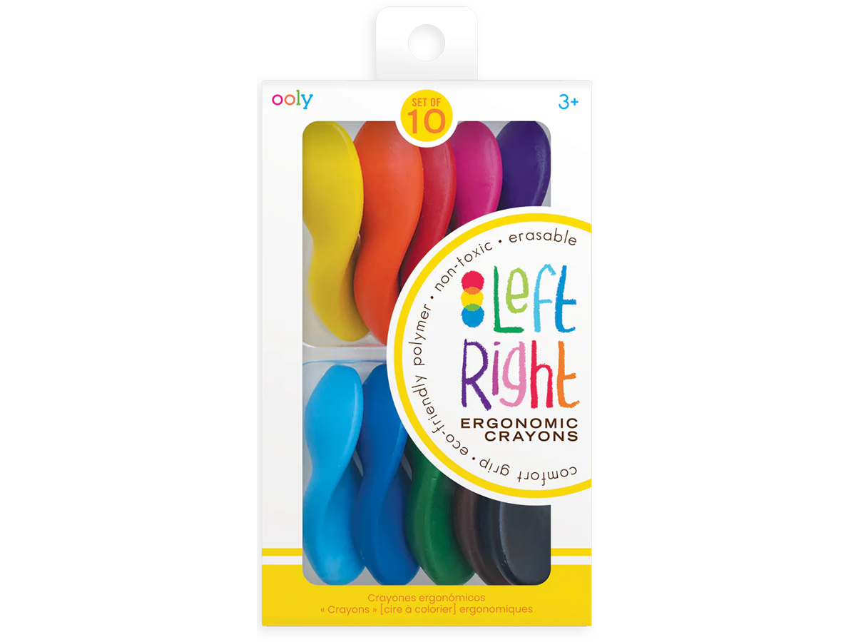 Are you right handed? Left handed? Ambidextrous? It doesn't matter with Left Right Crayons, they are ergonomic for everyone! These easy-to-hold crayons make drawing works of art comfortable and fun. Left Right Crayons are made with an eco-friendly polymer, are nontoxic and completely erasable. Set of 10 beautiful colors.